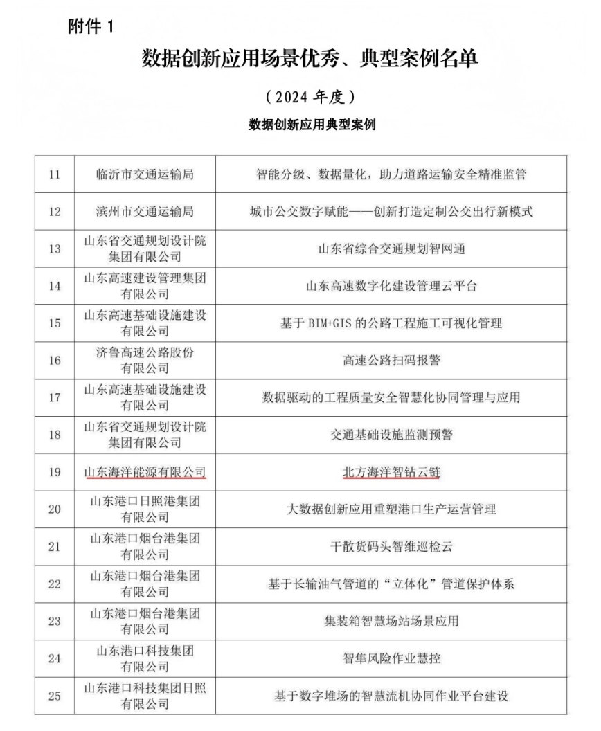 近日,山東海洋能源申報的“北方海洋智鉆云鏈”數字化應用場景,成功入選山東省交通運輸廳2024年度全省交通運輸行業數據創新應用典型案例。