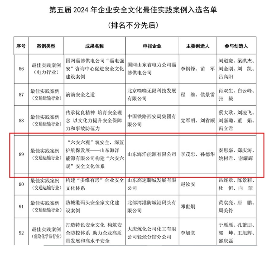 近日,公司申報的“六安六觀筑安全,深藍護航保發展——山東海洋能源有限公司構建六安六觀安全文化體系”安全文化成果,成功入選應急管理部宣傳教育中心第五屆 2024年企業安全文化最佳實踐案例。