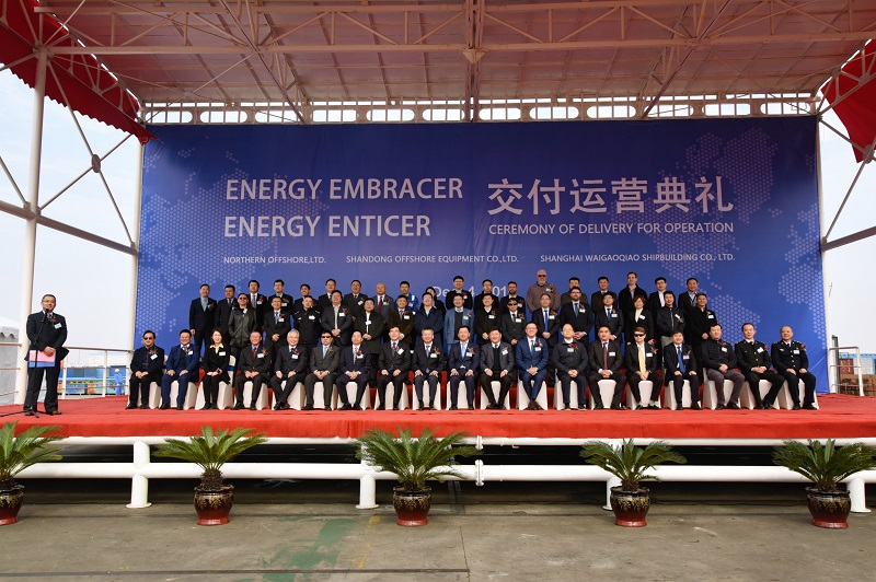 12月4日,公司旗下海工裝備兩座高性能自升式鉆井平臺Energy Embracer與Energy Enticer在上海外高橋造船有限公司順利交付運營,兩座平臺將前往卡塔爾北部海域,為卡塔爾國家石油公司提供海上油氣鉆井服務。山東省工業和信息化廳副廳長靖士寬,上海外高橋造船有限公司董事長王琦,集團公司黨委副書記、總經理趙顯福出席儀式并致辭,集團公司副總經理、公司黨委書記、董事長于冰,公司黨委副書記、首席執行官粟斌,公司首席技術官孫遠慧和公司副總經理李亞東參加儀式。
