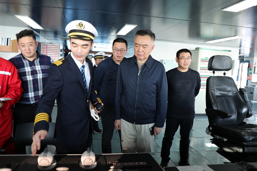 包劍英董事長實地察看了船舶工作區、貨艙、機艙、駕駛臺及船員生活區,詳細了解“慧海壹號”船舶構造和作業流程,并與船長、船員代表進行了座談。
