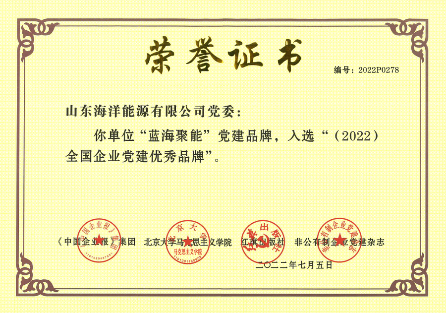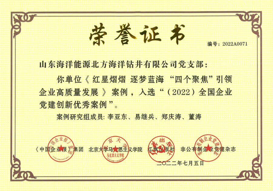 山東海洋能源有限公司黨委“藍海聚能”黨建品牌,入選“(2022)全國企業黨建優秀品牌”。北方海洋鉆井有限公司黨支部《紅星熠熠 逐夢藍海 “四個聚焦”引領企業高質量發展》案例,入選“(2022)全國企業黨建創新優秀案例”。