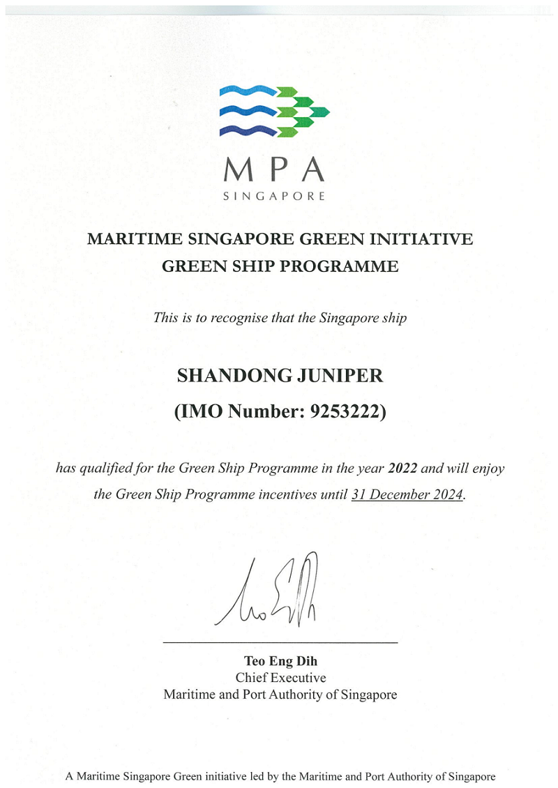 11月17日,公司旗下山東海洋液化天然氣有限公司首艘LNG運輸船“山東君博”輪 ( Shandong Juniper)獲得新加坡海事及港務管理局(MPA)頒發的“2022年度綠色船舶獎”。