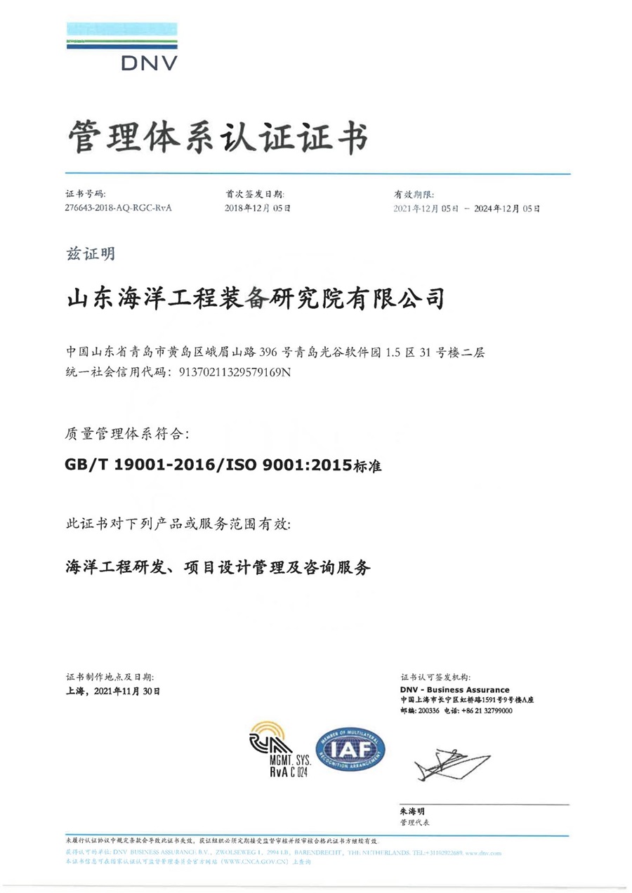 近日,山東海洋能源所屬海工研究院順利通過挪威船級社(DNV)認證中心的ISO9001:2015質量管理體系復審。2018年海工研究院通過DNV ISO9001質量體系認證以來,已連續5年順利通過認證復審。