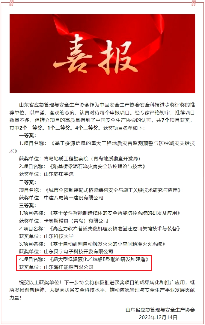 近日,中國安全生產協會主辦的第四屆安全科技進步獎獲獎名單揭曉。由山東省應急管理與安全生產協會推薦的山東海洋能源《超大型低溫液化乙烷船B型艙的研發和建造》,經形式審查、初評網評、初評會審、社會公示、現場答辯、評審委員會終評等程序,在1550個申報項目中脫穎而出,獲評三等獎。