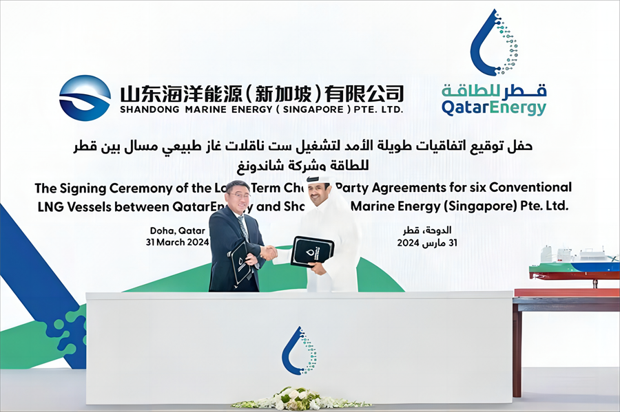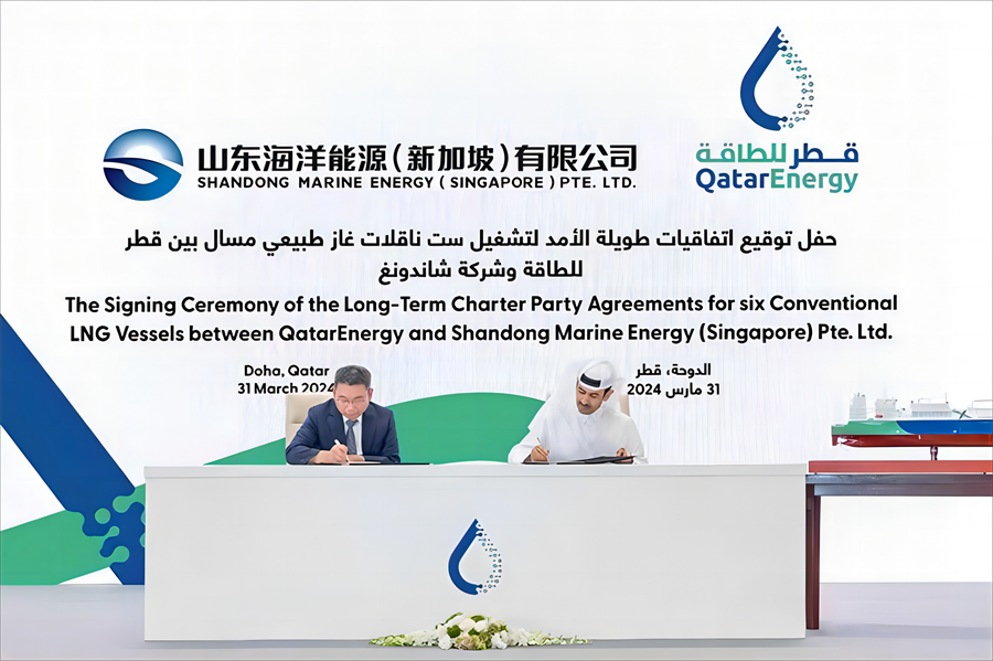 3月31日,山東海洋能源下屬山東海洋能源(新加坡)有限公司與卡塔爾能源公司(QatarEnergy)在卡塔爾首都多哈簽署6艘17.4萬立方米大型LNG運輸船項目,為其提供長期LNG運輸服務??ㄋ柲茉词聞諊鴦詹块L、卡塔爾能源總裁及首席執行官Saad Sherida Al-Kaabi參加簽約儀式,并與山東海洋能源黨委書記、董事長、總經理李茂忠現場簽約。本次項目簽約,標志著山東海洋能源在激烈的全球競爭中成功中標卡塔爾能源“百船計劃”項目,為助力共建“一帶一路”倡議再添新成果,以實際行動融入和服務國內國際雙循環相互促進的新發展格局。